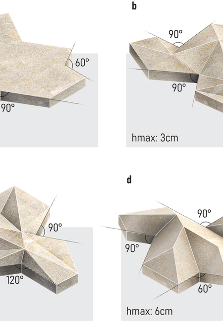 The source of inspiration for creating the form of the design is the "Einstein Tile," discovered by mathematicians. The Einstein Tile is a special geometric shape that means "single stone" and allows for the creation of patterns that never repeat itself. This shape is a thirteen-sided polygon, and when these polygons come together, they provide the opportunity to create non-periodic patterns. The Einstein Tile has been interpreted in three dimensions in the design. This approach preserves the unique structure of the thirteen-sided polygon in the plan view while bringing together four different faces with four different tiles in the section view to create a wall pattern. This method offers the possibility to gather limitless combinations. It takes inspiration from the endless variations found in natural landforms and translates them into a design that can be applied to various surfaces, bringing a harmonious blend of aesthetics and functionality.